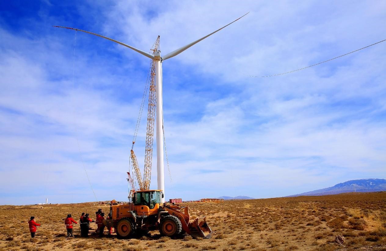 A wind turbine is being erected in a 30-kW wind farm in Ganzhou district, Zhangye, northwest China's Gansu province, Feb. 10, 2023. (People's Daily Online/Yang Yongwei)