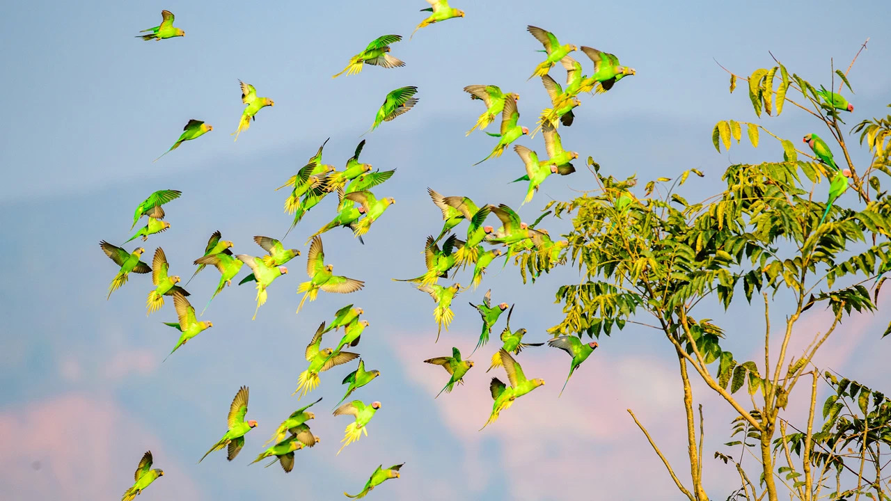Hundreds of blossom-headed parakeets have recently been spotted in Dehong, southwest China's Yunnan Province, setting a new record for the species' population observed in China. (Photo/People's Daily)