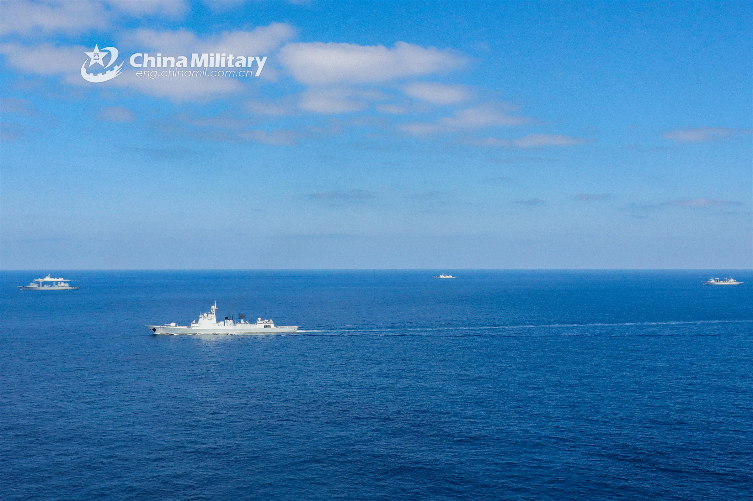 Chinese naval ships steam in formation during a joint escort training exercise conducted by China's 42nd and 43rd naval escort taskforces on February 3, 2023. (eng.chinamil.com.cn/Photo by Wang Qing)
