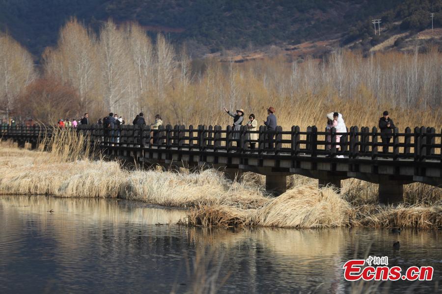 Tourists visit the Zouhun Bridge (Walking Marriage Bridge) on the Lugu Lake, Yanyuan, southwest China's Sichuan Province, Feb. 16, 2023. (Photo: China News Service/Wang Lei)