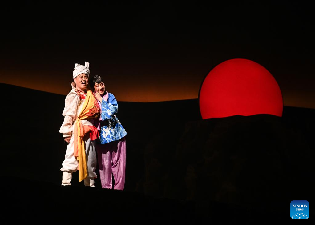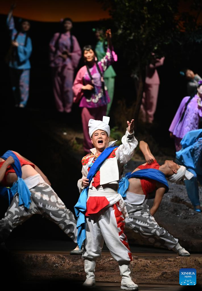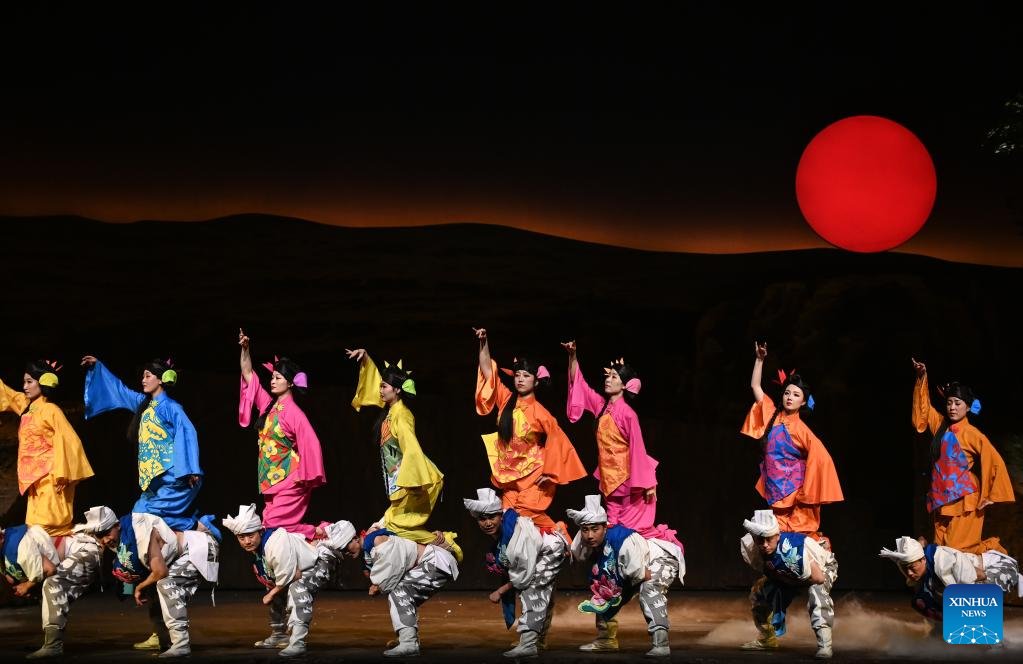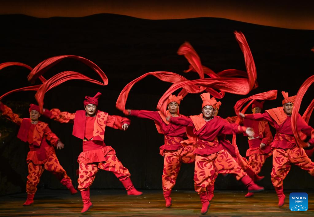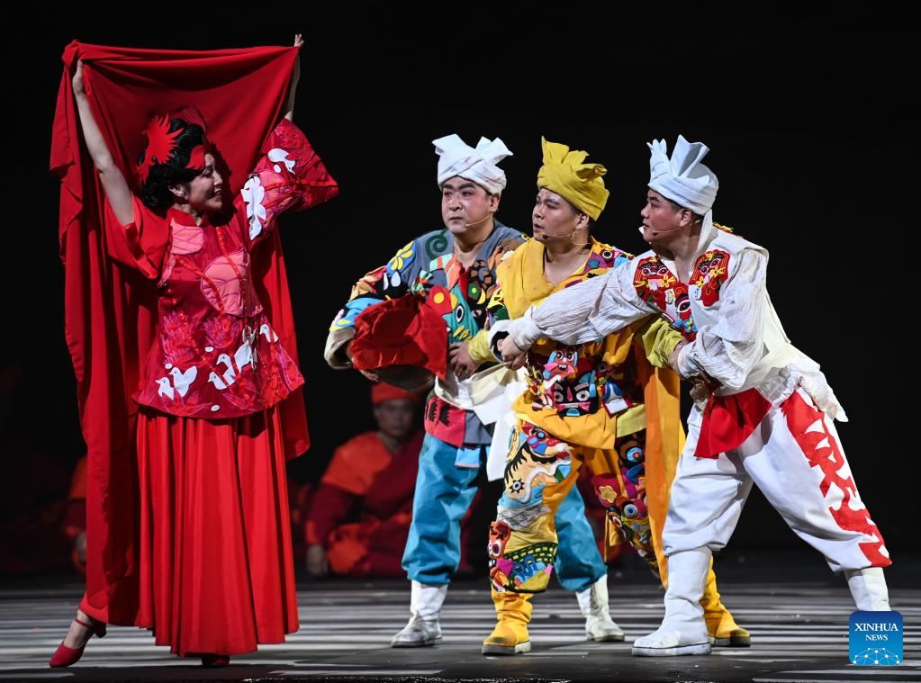 Artists perform in a yangge drama as a part of the first China Intangible Cultural Heritage Protection Annual Meeting in Yulin, northwest China's Shaanxi Province, Feb. 16, 2023. The first China Intangible Cultural Heritage Protection Annual Meeting is held here from Feb. 16 to 20, which features an opening ceremony and a series of performances, exhibitions, and forums. (Photo by Zou Jingyi/Xinhua)