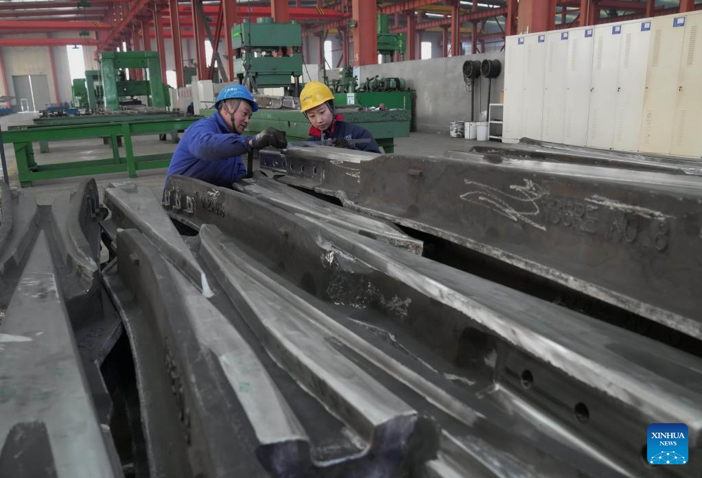 Workers operate at a workshop of a railway equipment manufacturing enterprise in Qinhuangdao, north China's Hebei Province, Feb. 16, 2023. (Xinhua/Yang Shiyao)