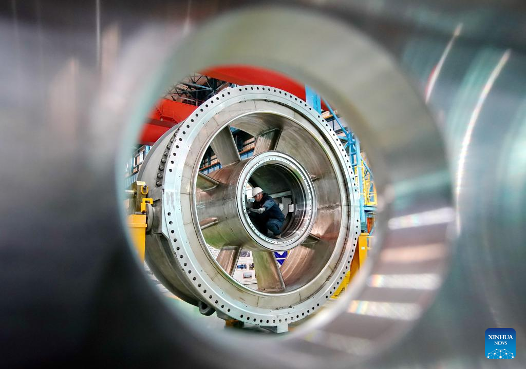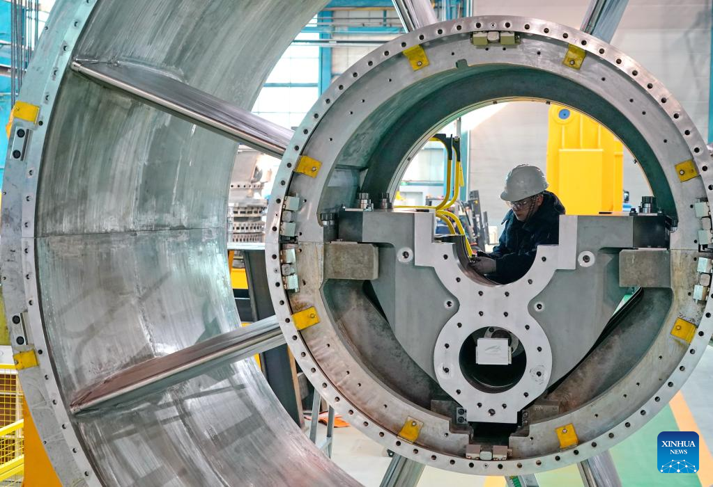 A worker operates at a workshop of the Harbin Electric Corporation (QHD) Heavy Equipment Company Limited in Qinhuangdao, north China's Hebei Province, Feb. 16, 2023. (Xinhua/Yang Shiyao)