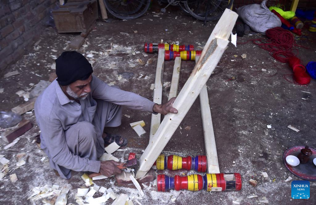 A worker makes the frame of a traditional bed locally called "Charpai" in northwest Pakistan's Peshawar on Feb. 17, 2023. (Photo by Saeed Ahmad/Xinhua)