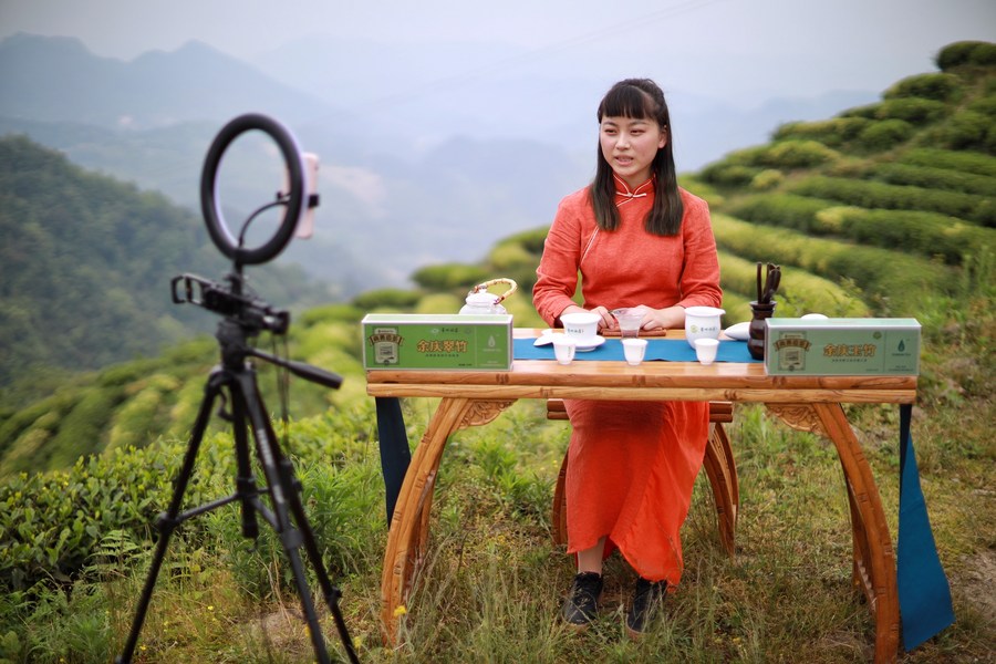 Li Jiali presents tea art via livestreaming at a tea garden of Chunjing Village in Baini Township, Yuqing County, southwest China's Guizhou Province, April 30, 2020. (Xinhua/Liu Xu)