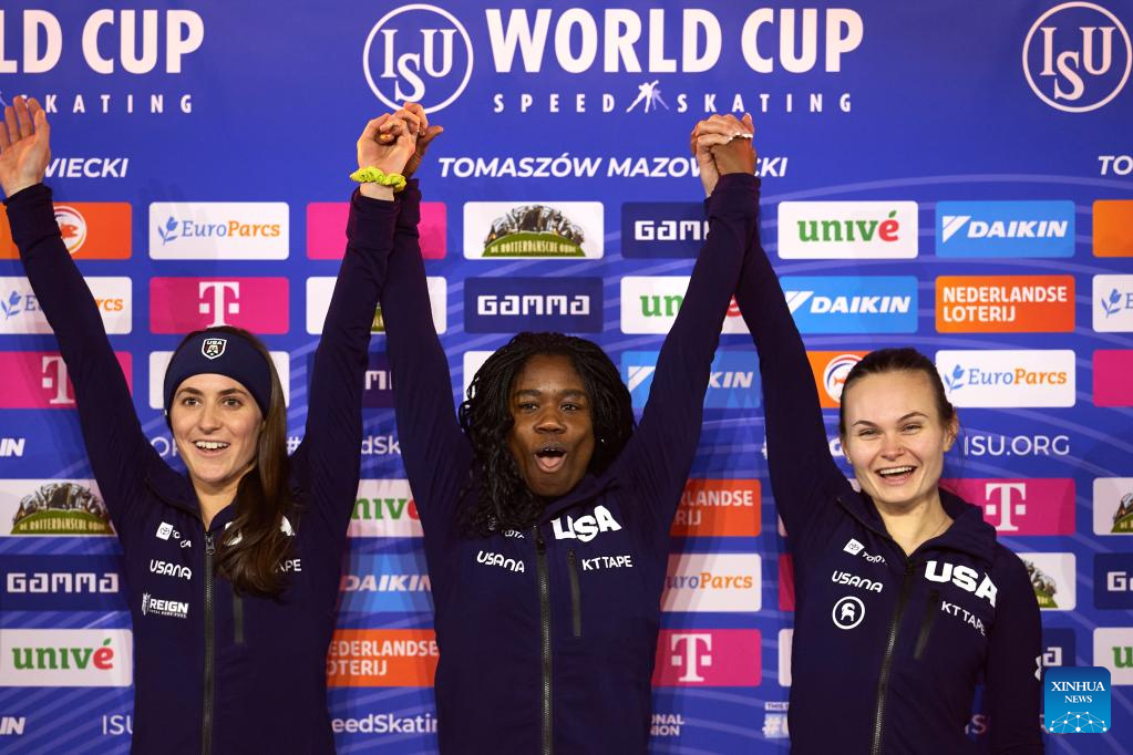 WARSAW, Feb. 18 (Xinhua) -- The United States won the women's team sprint at the ISU Speed Skating World Cup followed by Canada and China in Tomaszow Mazowiecki, Poland on Saturday.