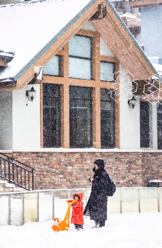 An adult and a child walk in the snow in Thaiwoo Ski Resort in Chongli district, Zhangjiakou city, in north China’s Hebei Province. (Photo/Publicity Department of the CPC Chongli District Committee)
