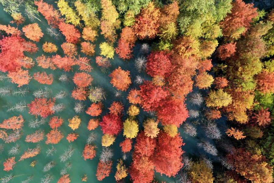 Aerial photo taken on Nov. 2, 2020 shows a view of a dawn redwood forest in Zhanghe Reservoir of Jingmen City, central China's Hubei Province. (Xinhua/Peng Qi)