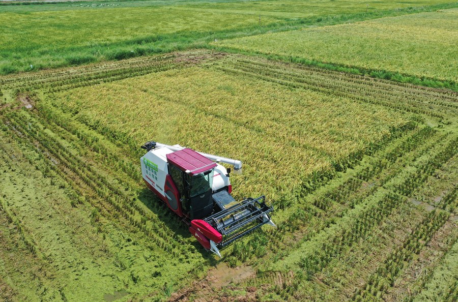 Aerial photo taken on July 20, 2022 shows an unmanned harvester working in Jiangxiang Township, Nanchang County of east China's Jiangxi Province. (Xinhua/Wan Xiang)