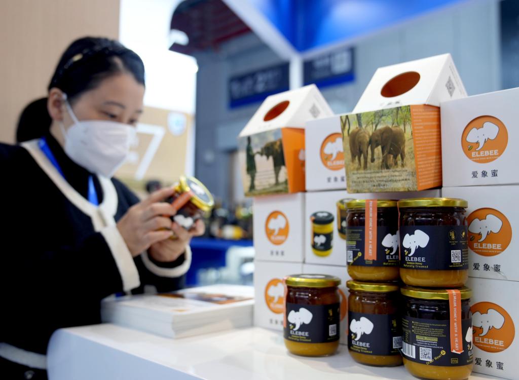 This photo taken on Nov. 7, 2022 shows honey from Zambia displayed at the food and agricultural products exhibition area of the fifth China International Import Expo (CIIE) in east China's Shanghai. (Xinhua/Liu Ying)
