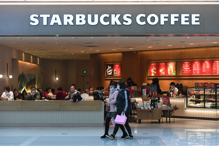Pedestrians walk past a Starbucks store in Shenyang, Liaoning province. Starbucks is operating over 6,090 stores in China. [PHOTO/CHINA DAILY]