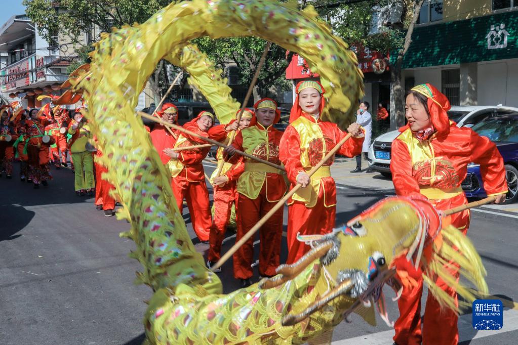 Photo taken on Feb. 20 shows villagers performing a dragon dance to celebrate the Longtaitou Festival in Huilong villiage, Yuyao, east China’s Zhejiang Province. (Xinhua/Zhang Hui)