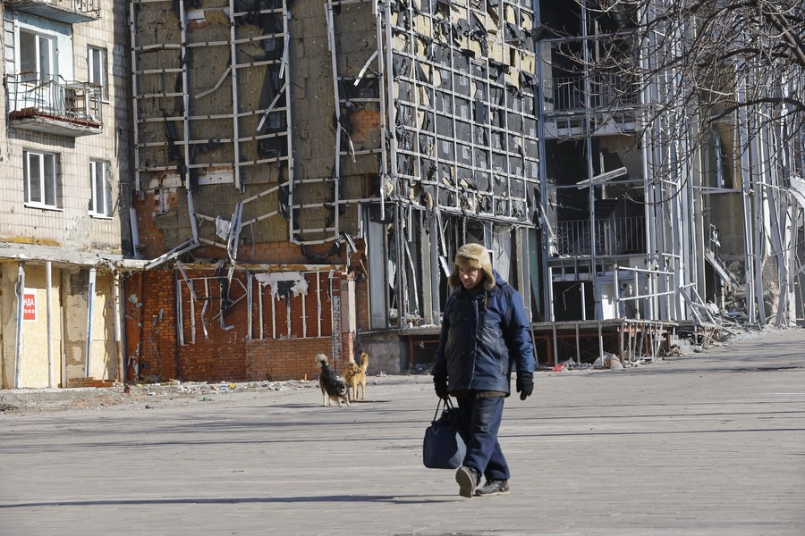 A man walks past damaged buildings in Mariupol, Jan. 27, 2023. (Photo by Victor/Xinhua)