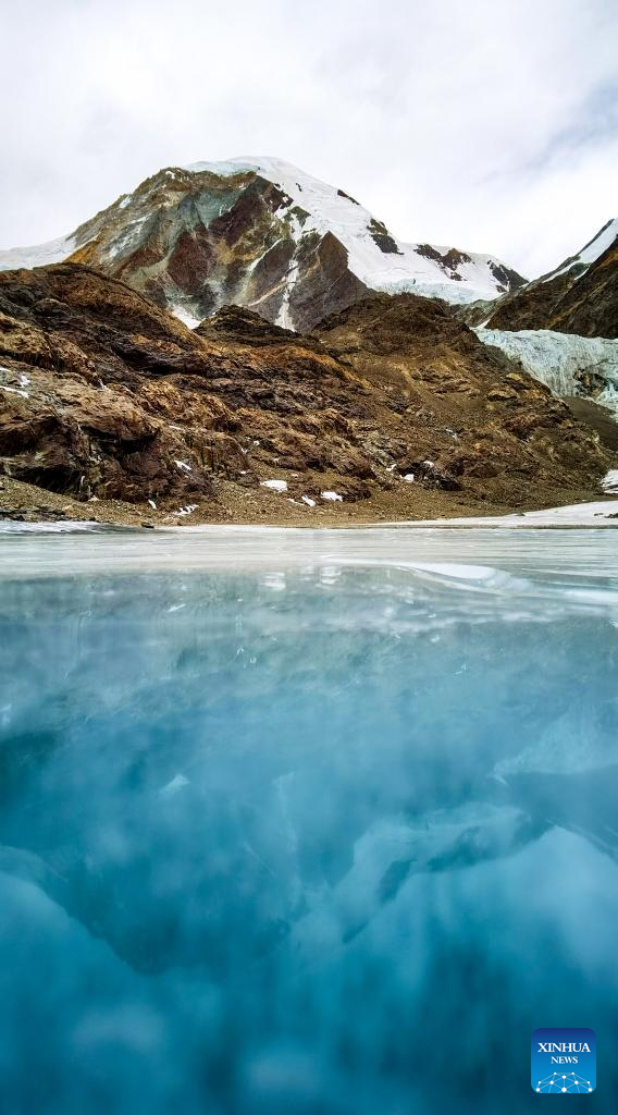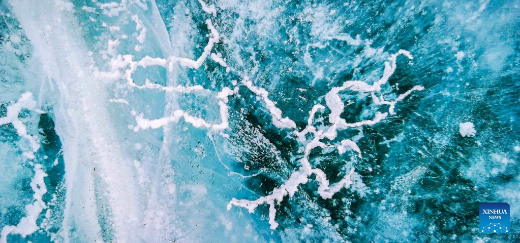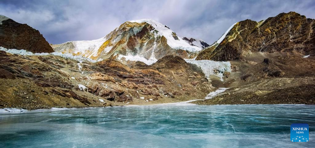 This photo taken with a mobile phone on Feb. 20, 2023 shows a view of an icy lake at the foot of Mount Qungmknag in Nyemo County of Lhasa, southwest China's Tibet Autonomous Region. (Xinhua/Shen Hongbing)