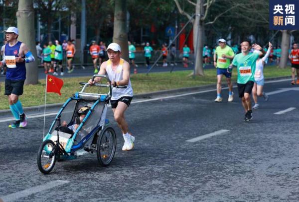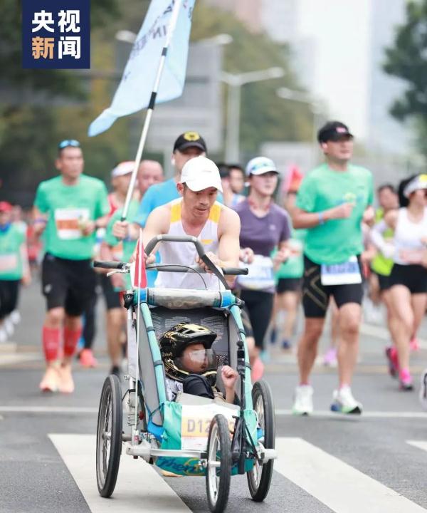 Luo Shujian and his son during the Shenzhen Marathon. (Photo/CCTV News)