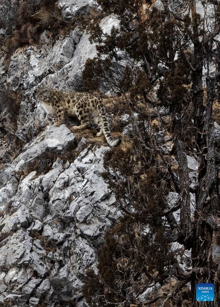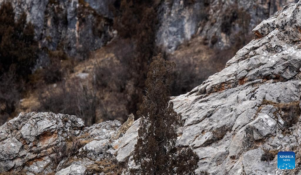 A snow leopard is pictured in a canyon in Zadoi County of Yushu Tibetan Autonomous Prefecture, northwest China's Qinghai Province, Feb. 21, 2023. (Xinhua/Fei Maohua)