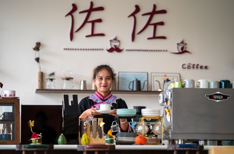 Villager Ge Nasi returned to Banli to run a coffee shop after graduating from college in 2021. The cafe, built in the shape of a stilted house, a kind of traditional dwelling of the local Lahu people, has become a tourist attraction in itself.