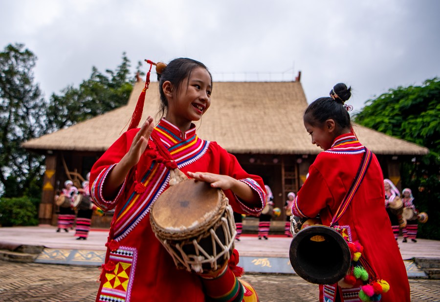 Young performers are seen in Banli Village of Donghui Town, Lancang Lahu Autonomous County in Pu'er City, southwest China's Yunnan Province, July 6, 2022. (Xinhua/Jiang Wenyao)