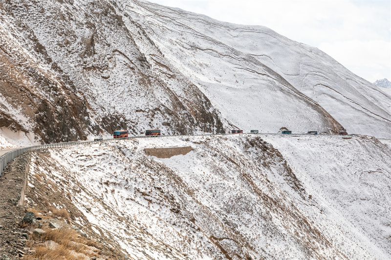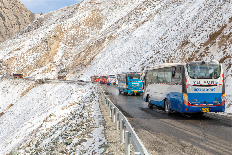 Photo shows a fleet of vehicles assigned to pick up students from Xihexiu township in northwest China's Xinjiang Uygur Autonomous Region running on the Xinjiang-Tibet Highway. (Photo/Chen Kai)