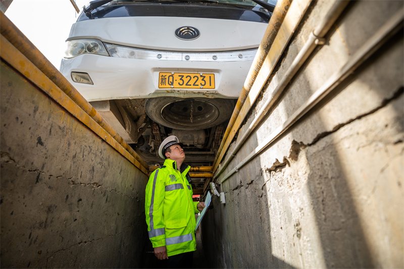 A police officer from the public security bureau of Yecheng county, northwest China's Xinjiang Uygur Autonomous Region, inspects a bus responsible for picking up students from Xihexiu township. (Photo/Chen Kai)