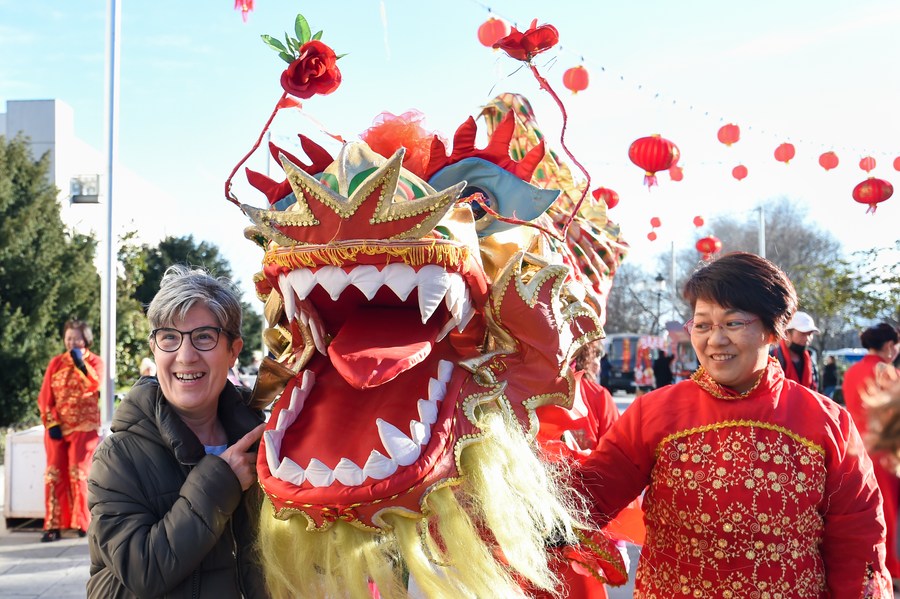 A resident poses for a photo with a lion dancer during an event to celebrate the Chinese New Year in Madrid, Spain, Jan. 20, 2023. (Photo by Gustavo Valiente/Xinhua)