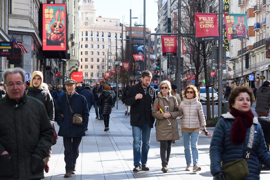 Chinese New Year posters are seen on a street in Madrid, Spain, Jan. 21, 2023. (Photo by Gustavo Valiente/Xinhua)