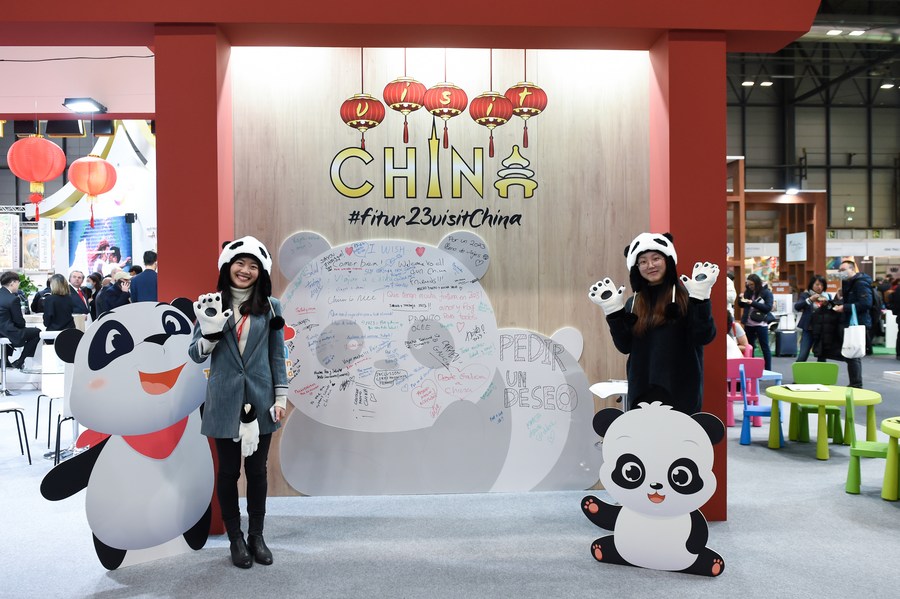Staff members pose for a photo in front of a Chinese exhibition booth during the International Tourism Fair FITUR 2023 in Madrid, Spain, Jan. 18, 2023. (Photo by Gustavo Valiente/Xinhua)