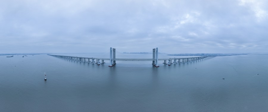 This stitched aerial photo taken on Feb. 4, 2023 shows the Quanzhou Bay cross-sea bridge, a part of the Fuzhou-Xiamen high-speed railway, in east China's Fujian Province. (Xinhua/Zhou Yi)