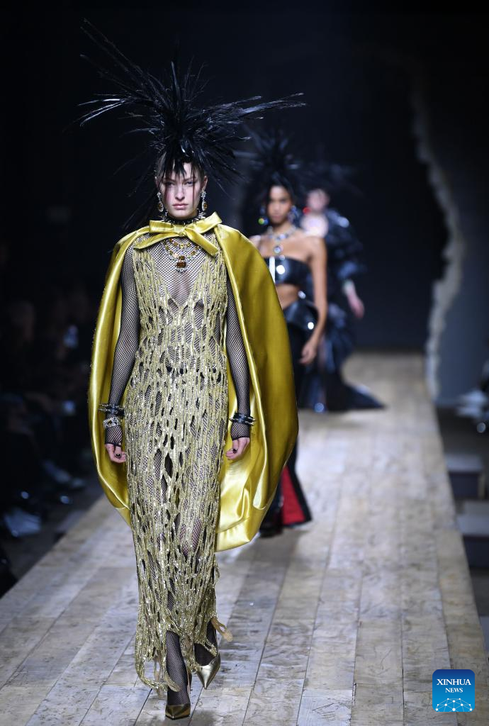 A model presents a creation from Moschino women's Fall/Winter 2023/2024 collection during Milan Fashion Week in Milan, Italy, on Feb. 23, 2023. (Xinhua/Jin Mamengni)