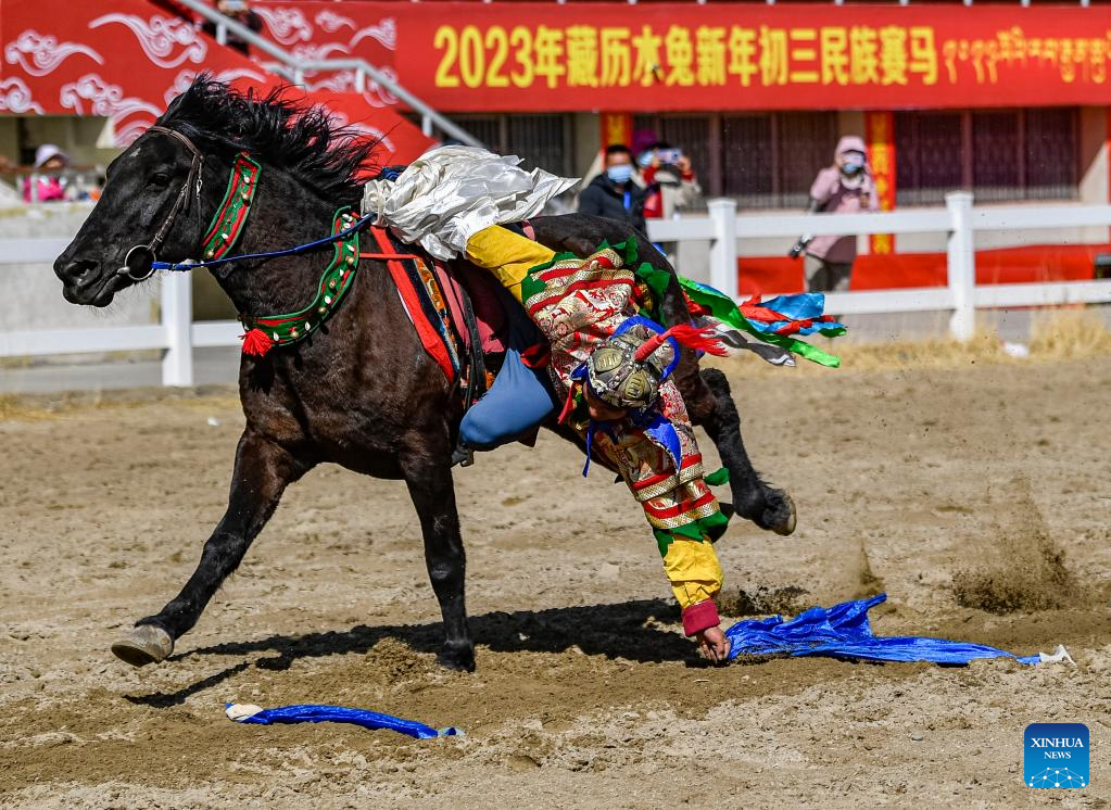 A rider picks up hada during an equestrian show in Lhasa, southwest China's Tibet Autonomous Region, Feb. 23, 2023. An annual equestrian show was held here on Thursday to celebrate the Tibetan New Year. (Xinhua/Zhang Rufeng)