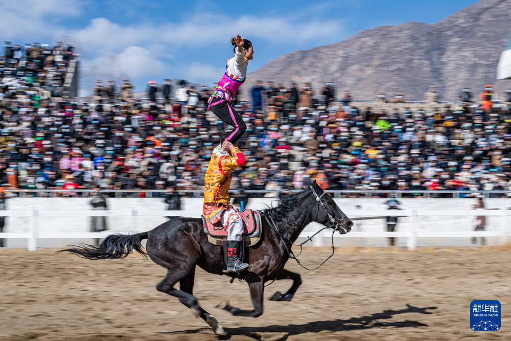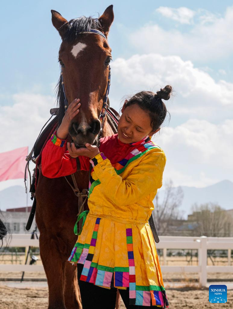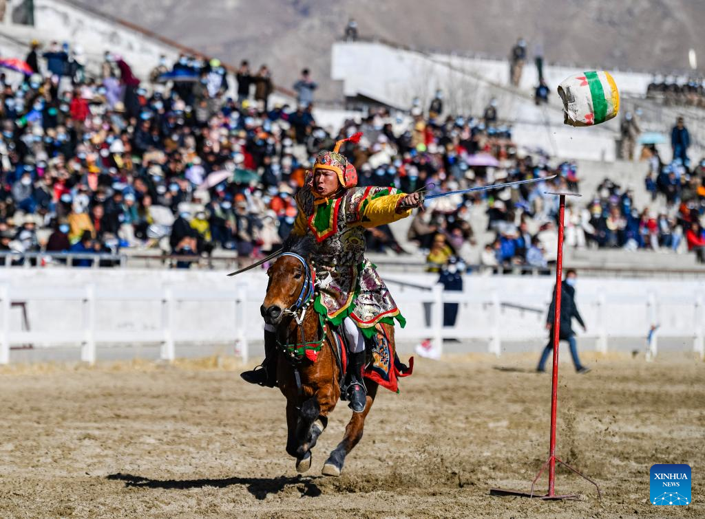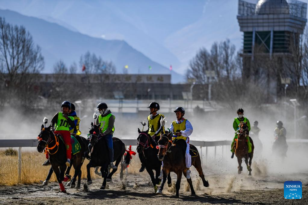 Riders compete in a horse racing during an equestrian show in Lhasa, southwest China's Tibet Autonomous Region, Feb. 23, 2023. An annual equestrian show was held here on Thursday to celebrate the Tibetan New Year. (Xinhua/Zhang Rufeng)