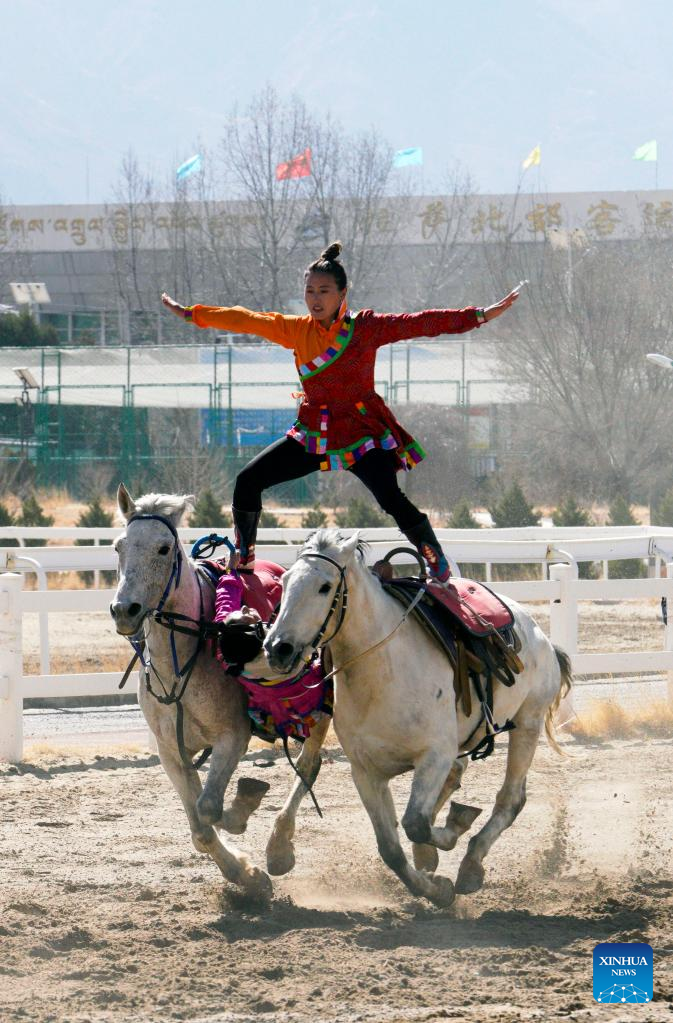 A rider on horseback performs during an equestrian show in Lhasa, southwest China's Tibet Autonomous Region, Feb. 23, 2023. An annual equestrian show was held here on Thursday to celebrate the Tibetan New Year. (Xinhua/Zhang Rufeng)