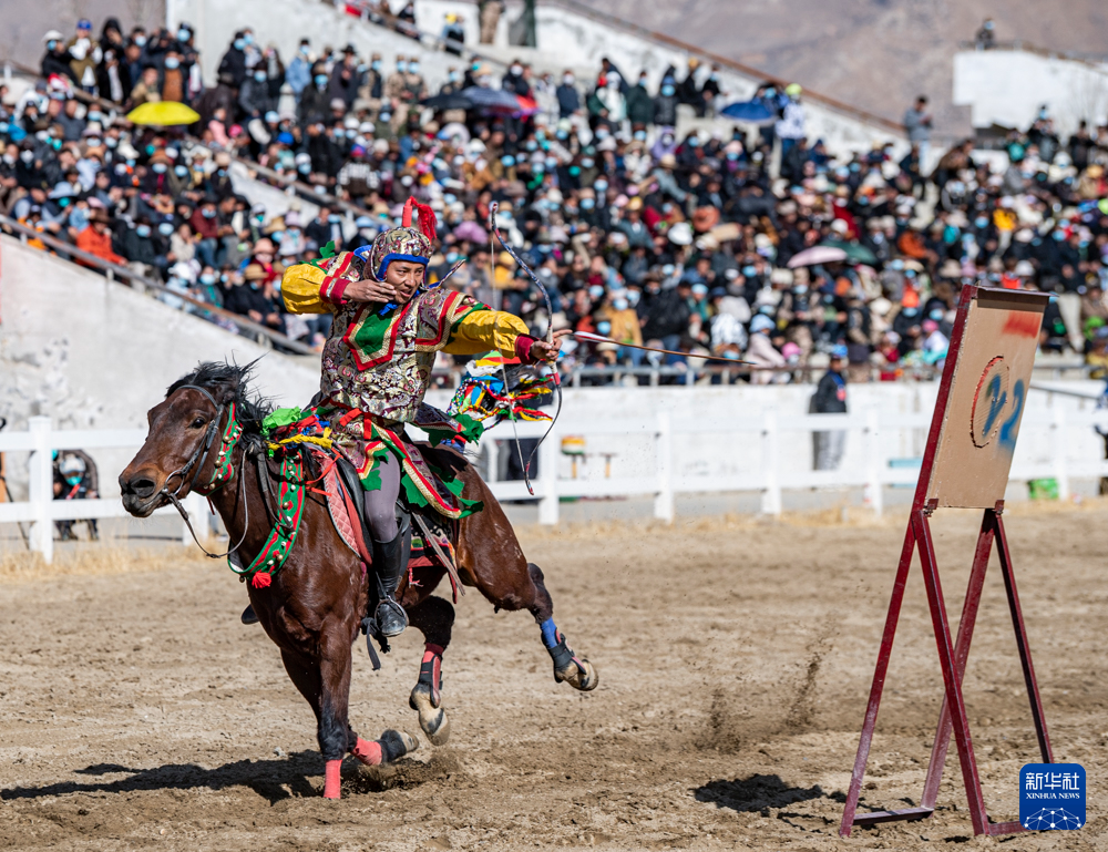 A rider performs archery during an equestrian show in Lhasa, southwest China's Tibet Autonomous Region, Feb. 23, 2023. An annual equestrian show was held here on Thursday to celebrate the Tibetan New Year. (Xinhua/Sun Fei)