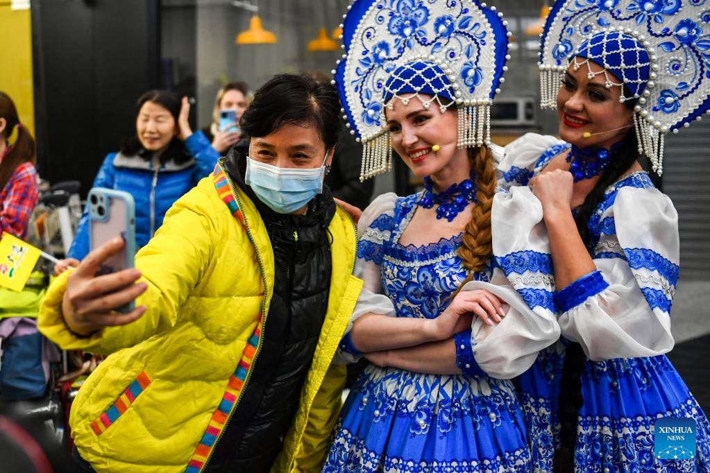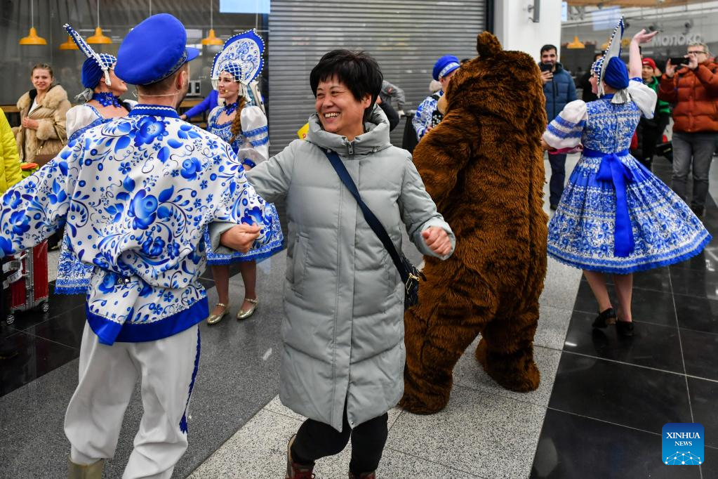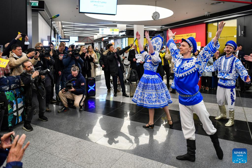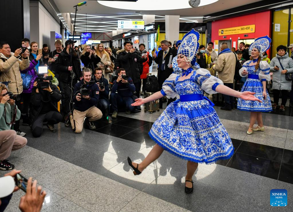 Staff members perform for Chinese travelers during a welcoming activity at the Sheremetyevo International Airport in Moscow, Russia, Feb. 23, 2023. Russia on Thursday welcomed the first group tour of Chinese tourists since China resumed outbound group travel to 20 countries on Feb. 6. (Xinhua/Cao Yang)
