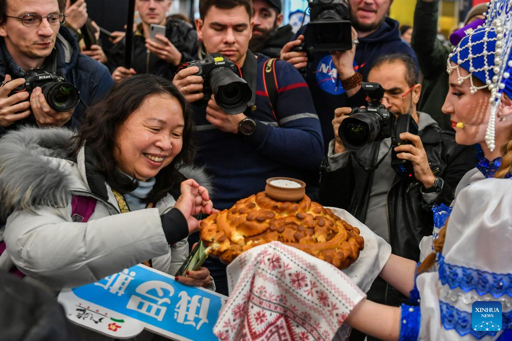 A Chinese traveler tastes bread during a welcoming activity at the Sheremetyevo International Airport in Moscow, Russia, Feb. 23, 2023. Russia on Thursday welcomed the first group tour of Chinese tourists since China resumed outbound group travel to 20 countries on Feb. 6. (Xinhua/Cao Yang)