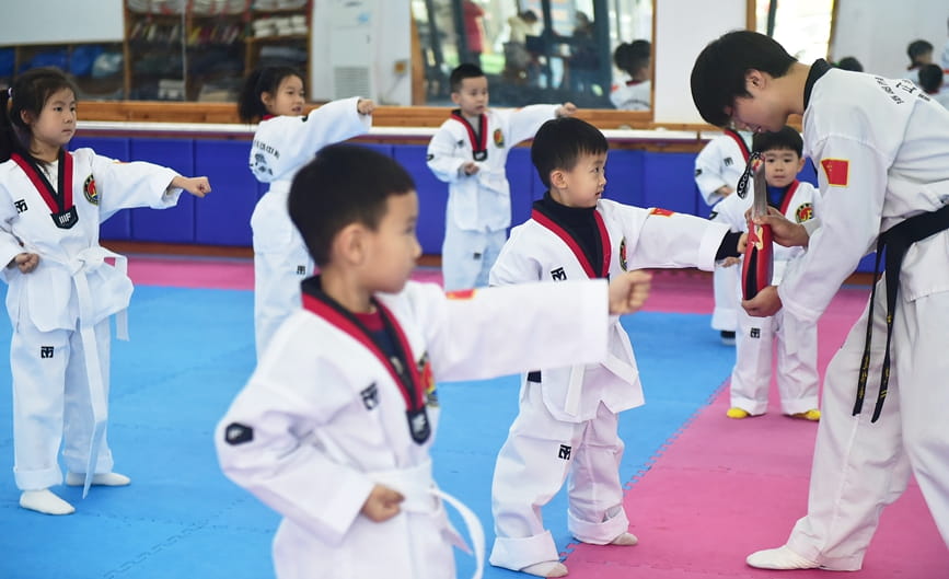 Children learn Taekwondo under the instruction of a teacher at Luoyang Youth Children’s Activity Center, in Luoyang city, north China’s Henan Province. (People’s Daily Online/Huang Zhengwei)