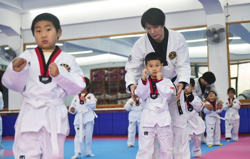 Children learn Taekwondo under the instruction of a teacher at Luoyang Youth Children’s Activity Center, in Luoyang city, north China’s Henan Province. (People’s Daily Online/Huang Zhengwei)