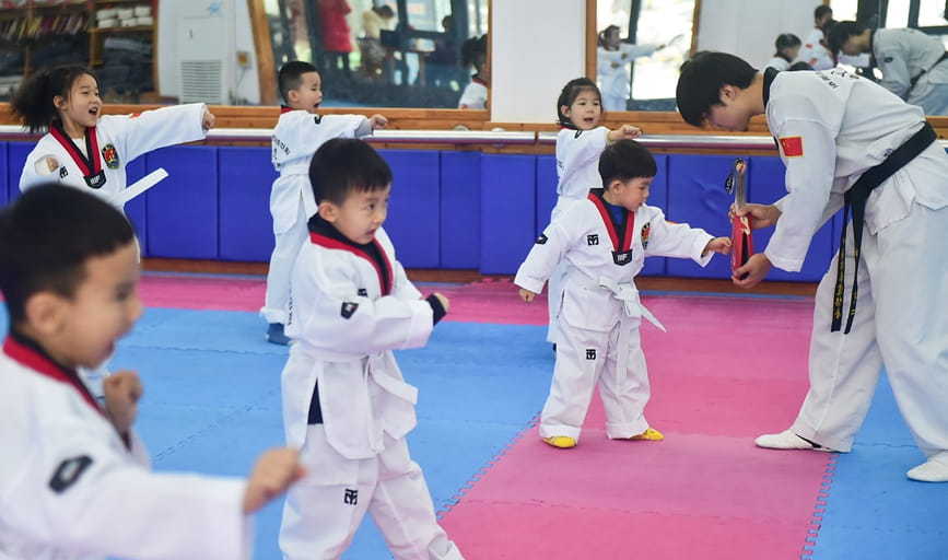Children learn Taekwondo under the instruction of a teacher at Luoyang Youth Children’s Activity Center, in Luoyang city, north China’s Henan Province. (People’s Daily Online/Huang Zhengwei)