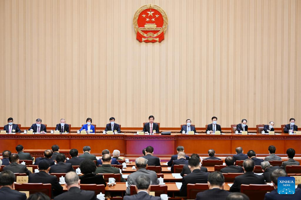 Members of the 13th NPC Standing Committee adopted the committee's work report. The Council of Chairpersons of the NPC Standing Committee proposed entrusting Li to deliver the work report to the first session of the 14th NPC on behalf of the committee.