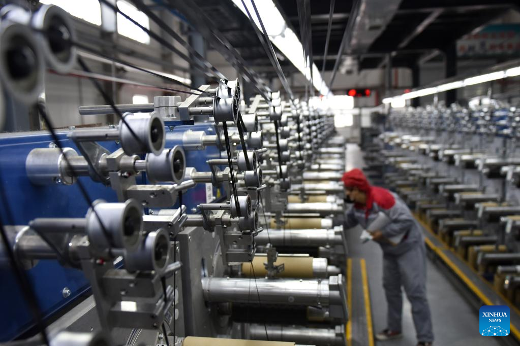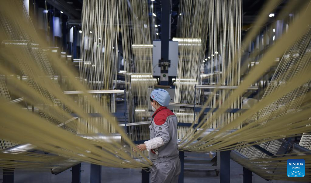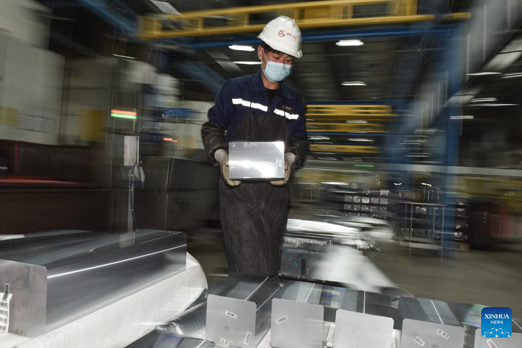 A worker works at a workshop of a photovoltaic modules manufacturer in Xining, northwest China's Qinghai Province, Feb. 22, 2023. Qinghai is an important clean energy production base in China. In recent years, the photovoltaic industry has developed rapidly in Xining City, and photovoltaic related products are in high demand. (Xinhua/Wu Gang)