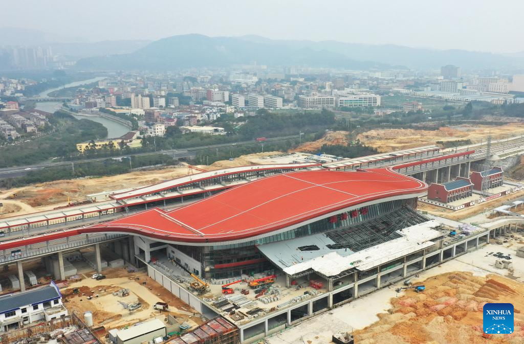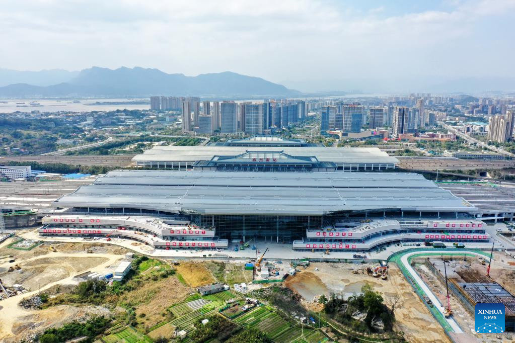 This aerial photo taken on Feb. 21, 2023 shows the Fuzhou South Railway Station under construction in Fuzhou, southeast China's Fujian Province. The 277-km railway runs along southeast China's coastline and crosses over three major bays on gigantic bridges. It's the country's first sea-crossing high-speed railway. With a designed speed of 350 km per hour and eight stations along the route, it is expected to slash the travel time between the two cities to just one hour. (Xinhua/Lin Shanchuan)