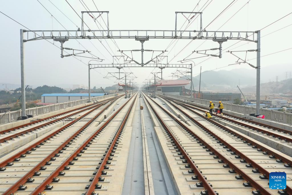 This aerial photo taken on Feb. 19, 2023 shows the construction site near the Fuqing West Railway Station of the new Fuzhou-Xiamen high-speed railway in southeast China's Fujian Province. The 277-km railway runs along southeast China's coastline and crosses over three major bays on gigantic bridges. It's the country's first sea-crossing high-speed railway. With a designed speed of 350 km per hour and eight stations along the route, it is expected to slash the travel time between the two cities to just one hour. (Xinhua/Lin Shanchuan)