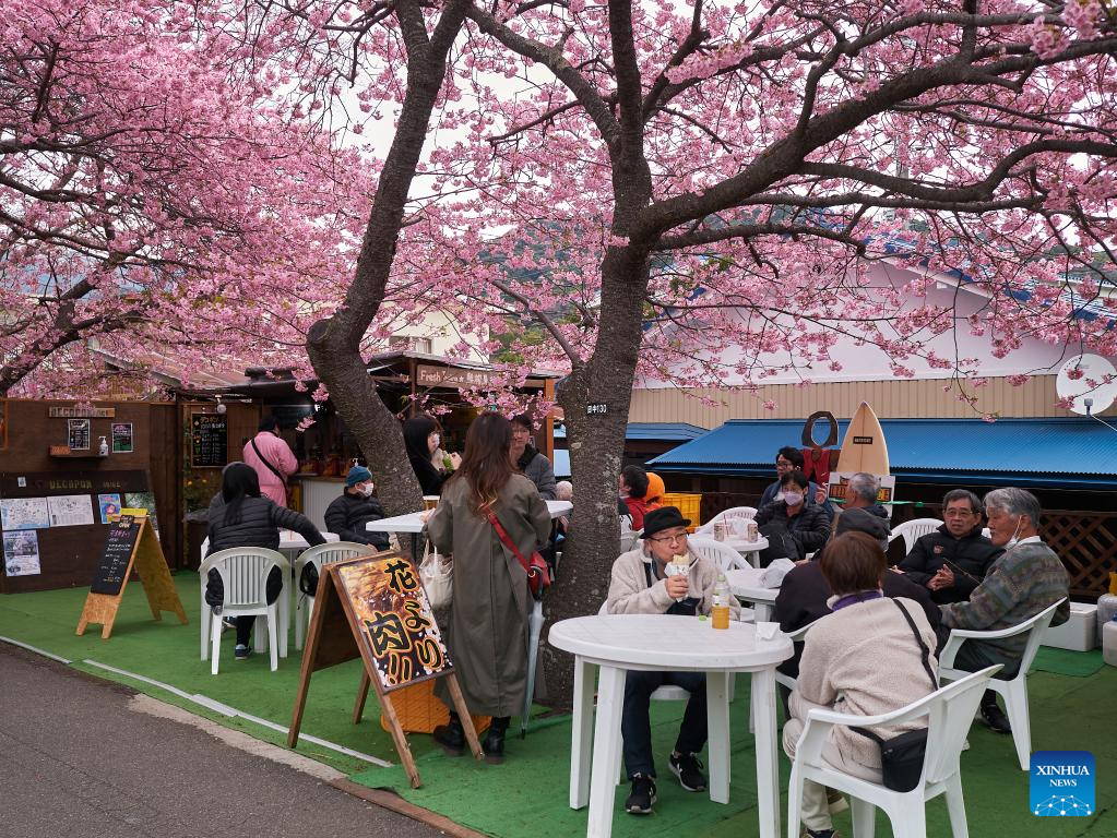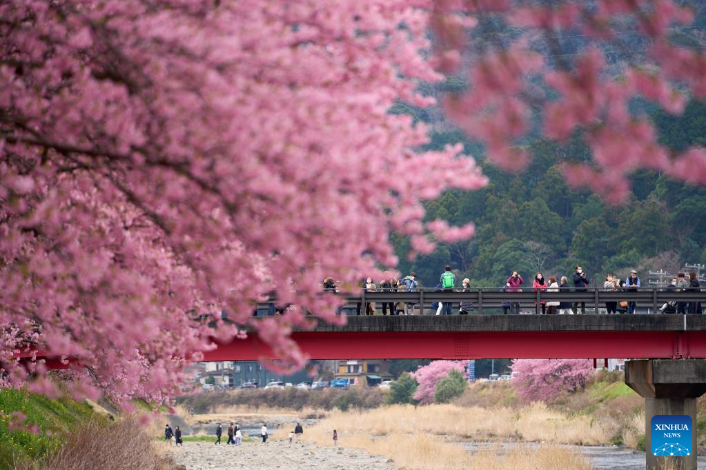 People enjoy early-blooming Kawazu cherry blossoms in Kawazu of Shizuoka Prefecture, Japan, Feb. 24, 2023. (Xinhua/Zhang Xiaoyu)