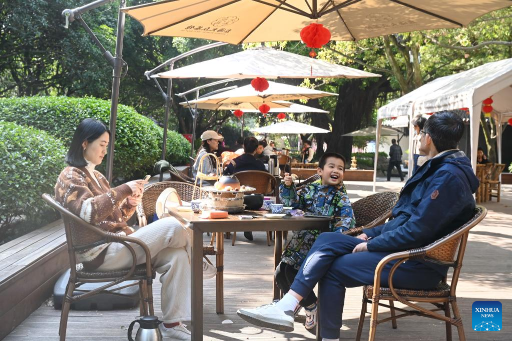 People enjoy their leisure time at an outdoor tea house in Zuohai Park in Fuzhou, southeast China's Fujian Province, Feb. 26, 2023. The time-honored tea culture has contributed to the thriving of tea houses in Fuzhou. (Xinhua/Lin Shanchuan)