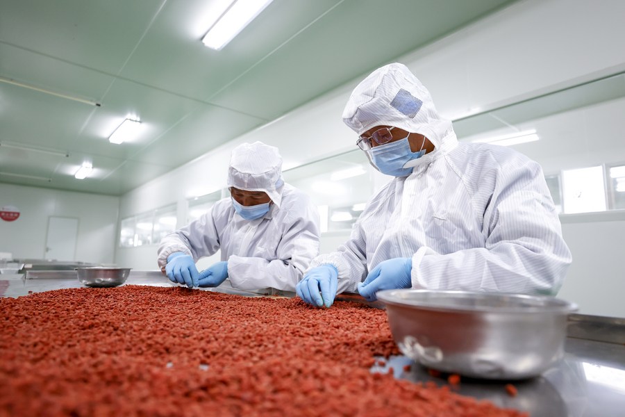 Employees work at Goji berry processing workshop in Tongde Village of Tongxin County, Wuzhong, northwest China's Ningxia Hui Autonomous Region, Oct. 23, 2020. (Xinhua/Feng Kaihua)