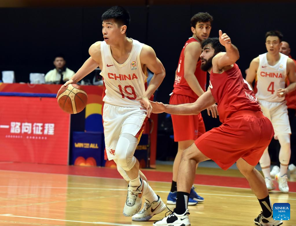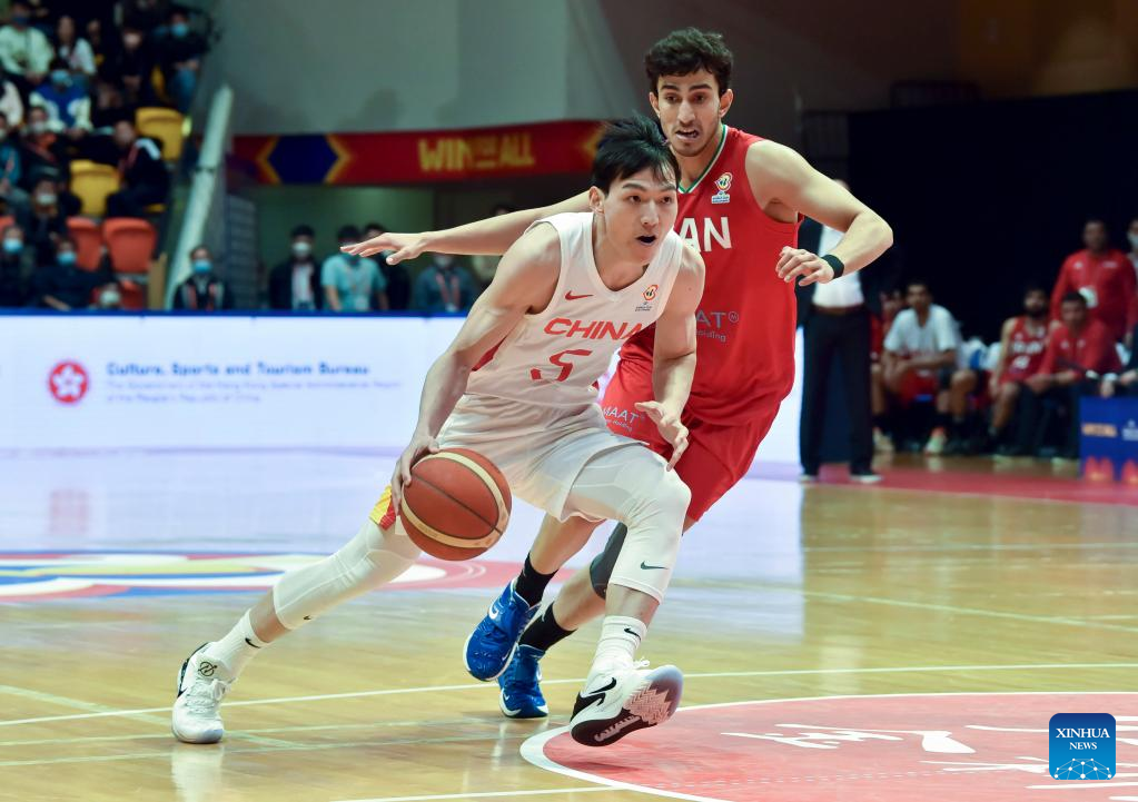 Cui Yongxi (1st L) of China breaks through during the Group F match between China and Iran of FIBA Basketball World Cup Asian Qualifiers in Hong Kong, south China, Feb. 26, 2023. (Xinhua/Lo Ping Fai)