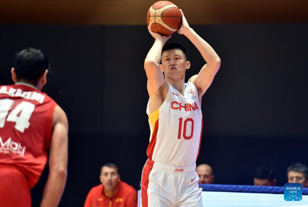 Zhou Peng of China shoots during the Group F match between China and Iran of FIBA Basketball World Cup Asian Qualifiers in Hong Kong, south China, Feb. 26, 2023. (Xinhua/Lo Ping Fai)