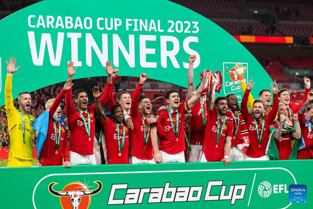 Manchester United's players celebrate with the trophy during the awarding ceremony for the Football League Cup Final match between Manchester United and Newcastle United in London, Britain, on Feb. 26, 2023. (Xinhua)
