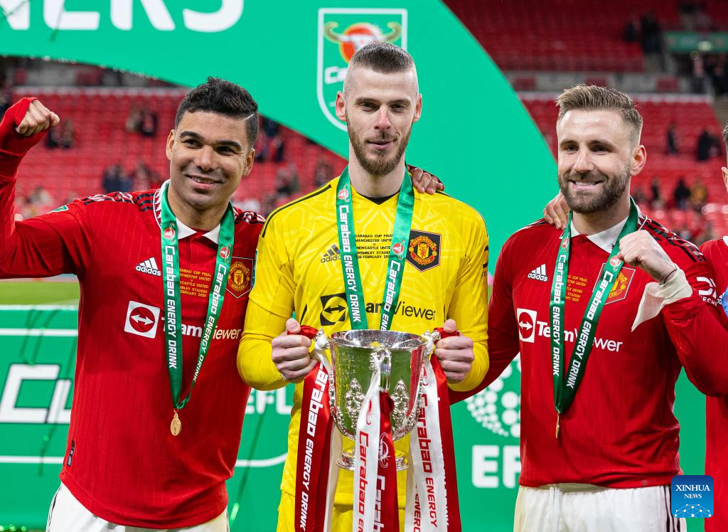 Manchester United's goalkeeper David de Gea (C), players Casemiro (L) and Luke Shaw celebrate with the trophy after the awarding ceremony for the Football League Cup Final match between Manchester United and Newcastle United in London, Britain, on Feb. 26, 2023. (Xinhua)