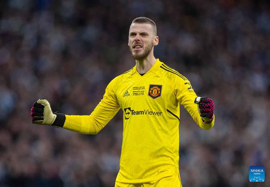 Manchester United's goalkeeper David de Gea celebrates his side's opening goal during the Football League Cup Final match between Manchester United and Newcastle United in London, Britain, on Feb. 26, 2023. (Xinhua)